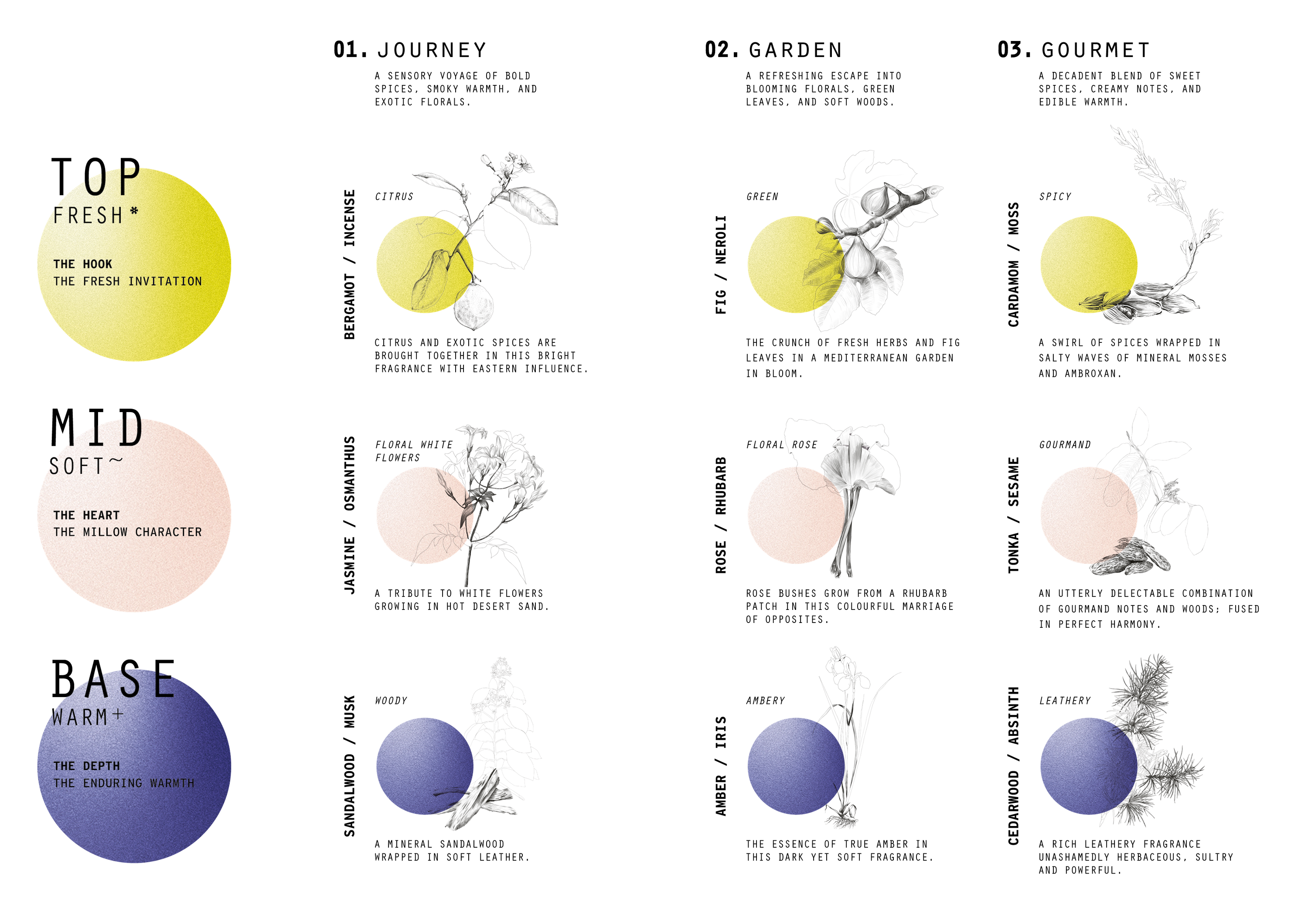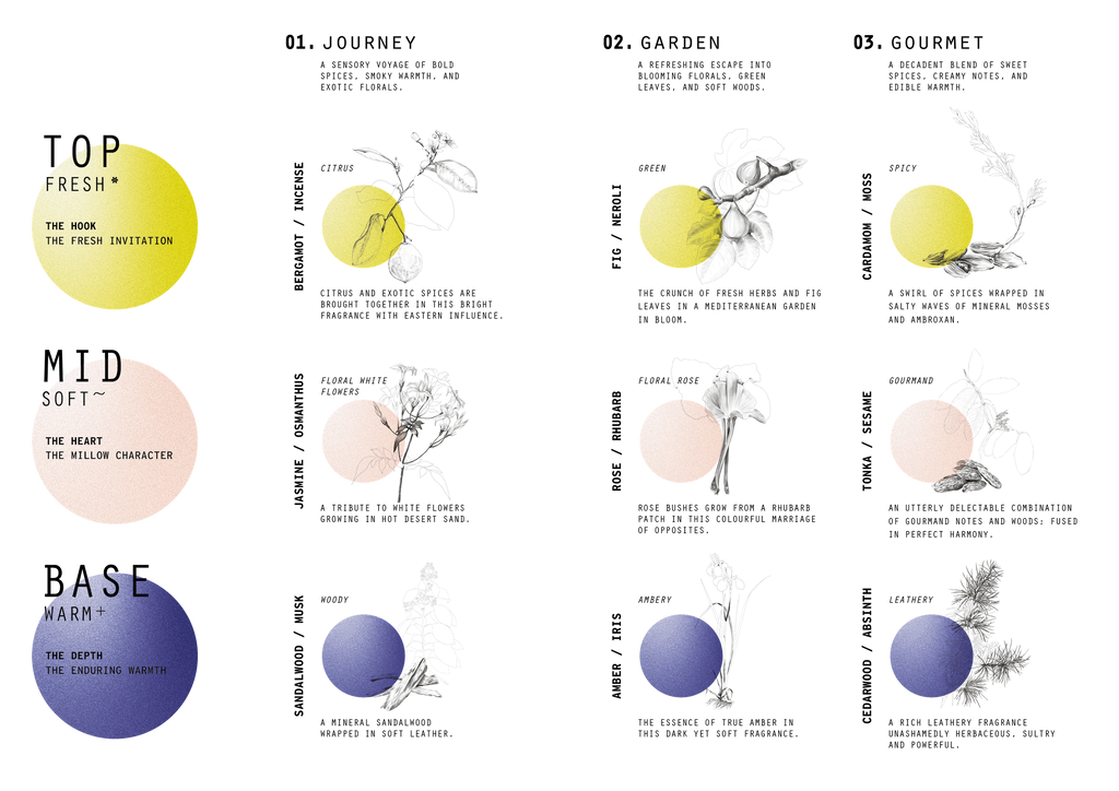 - One Top (fresh), one Mid (mellow), one Base (deep) of your choice